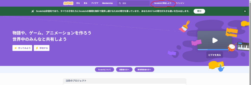 まず、「スクラッチ」と調べ公式サイトに飛びます。そのあとスクラッチに参加しようを(丸がついているとこ)クリックします。